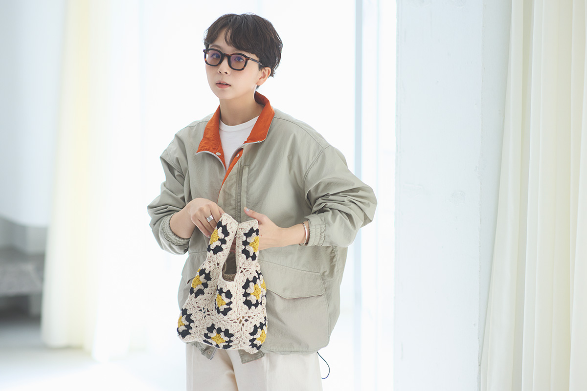 ブルゾン¥26,400、Tシャツ¥6,990/ともにタロウトウキョウ、サングラス¥40,700/ギュパール、シルバーバングル¥55,000、シルバー3連リング¥49,500/ともに市松、バッグ¥8,580/マクマホンニッティングミルズ
