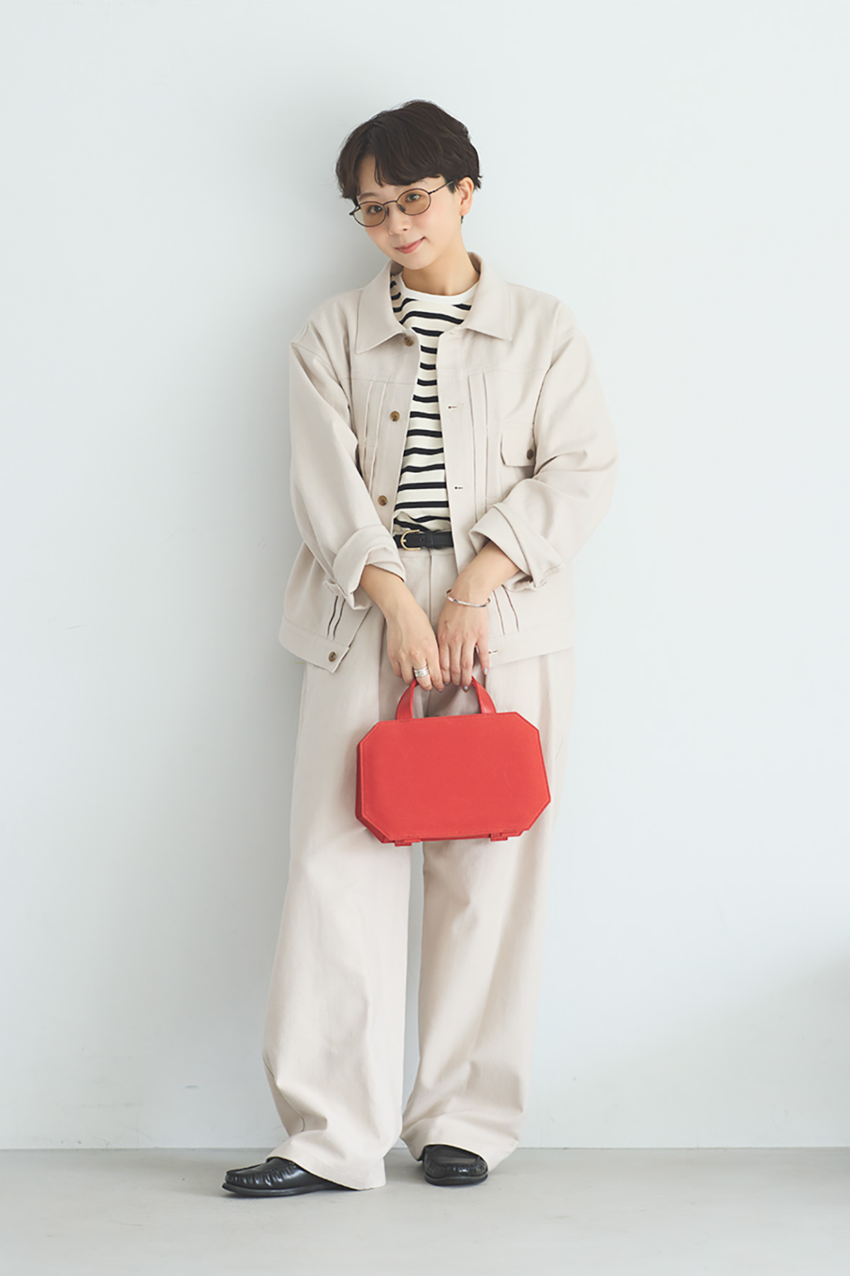 ジャケット¥33,000、ボーダーTシャツ¥6,990、タックパンツ¥16,500/すべてタロウトウキョウ、ショルダー付ハンドバッグ¥19,800/カミヒトエ、その他/本人私物