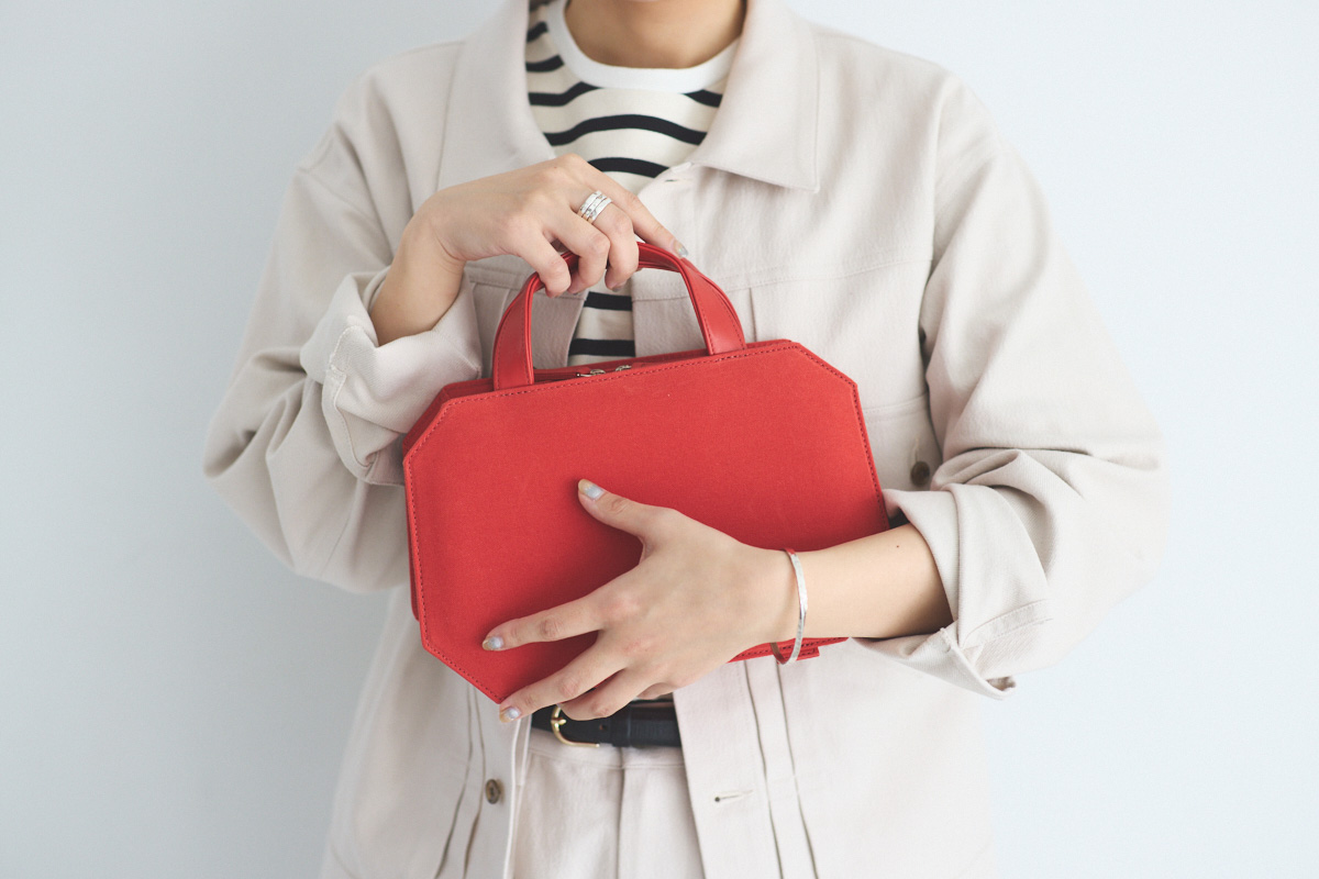 和紙など日本の伝統素材を使い、モダンなバッグを提案する「KAMIHITOE」。こちらのハンドバッグは、折り紙のようなシルエットとパリッとしながらもやわらかな風合いが印象的。