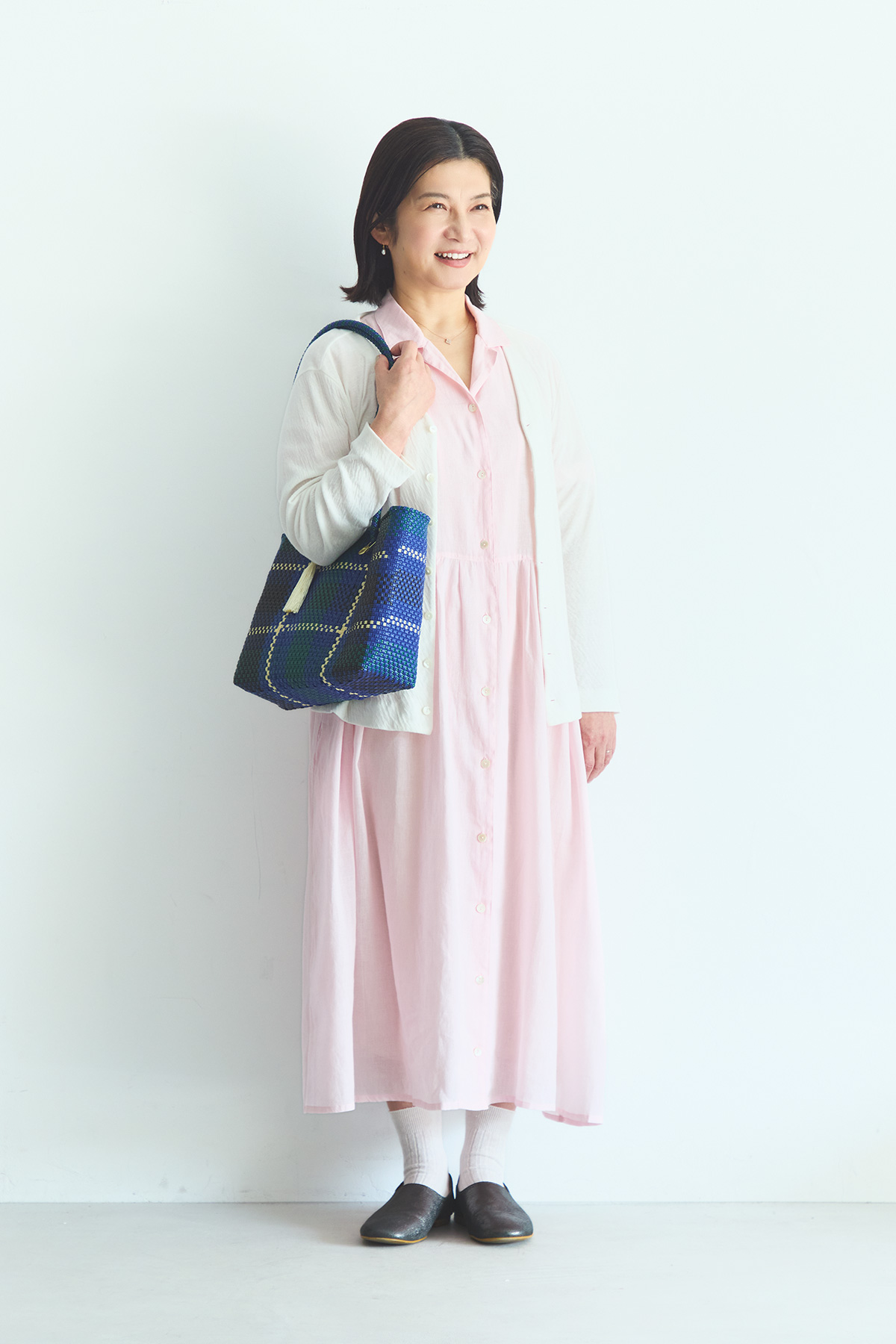 「インド綿のワンピースは着心地がよく、速乾性もあり、夏でも涼しく過ごせる頼れる一枚。わたしにとっては、まさに制服のような存在です。軽くて丈夫なメルカドバッグは、雨に濡れてもさっと拭くだけで乾くなど、機能性の高さも魅力なんです」。