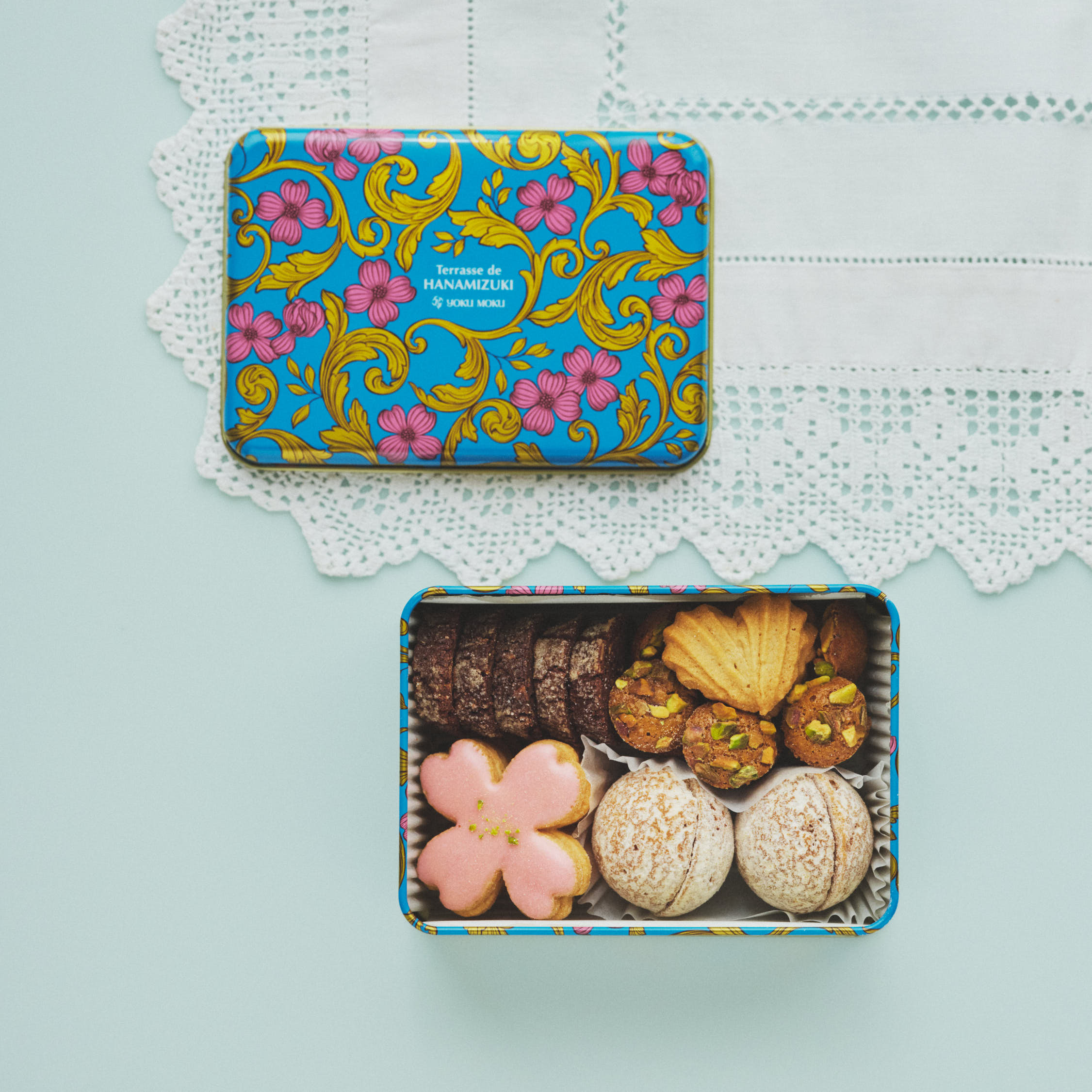48年前のヨックモック 青山本店創業当時から、中庭で店を見守り続けるしあわせのシンボル・ハナミズキをモチーフとしたクッキー缶。ハナミズキをイメージしたアイシングサブレや和三盆のほろほろクッキー、ピスタチオのクロッカンなど、素材のよさが際立つバラエティ豊かな焼き菓子を堪能できます。