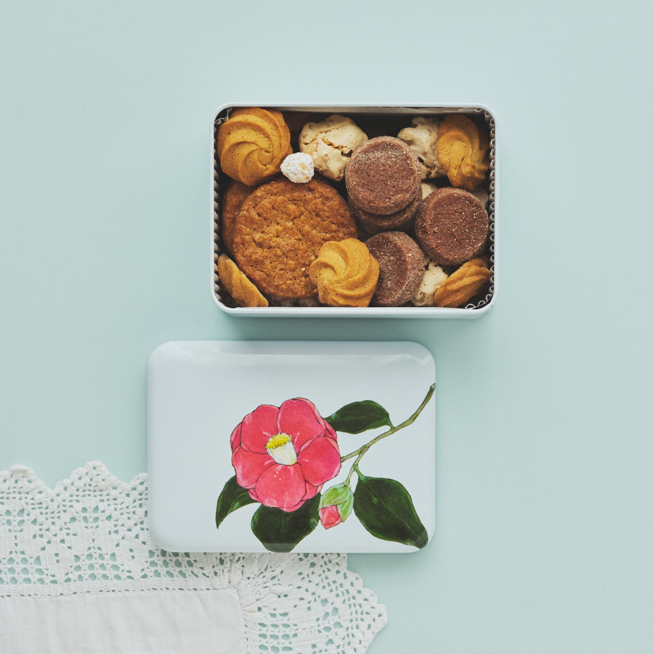 オーナーパティシエの菅又亮輔さんが手がける、Ryouraのクッキー缶。缶に描かれた椿は、菅又さんの出身地である佐渡島に咲く椿をイメージしたもの。ほんのりシナモンが香るサブレ ショコラや、クレープ生地入りでザクザク食感のサブレ フィアンティーヌなど、食感や香りの異なる5種類のサブレは手が止まらなくなるおいしさ。
