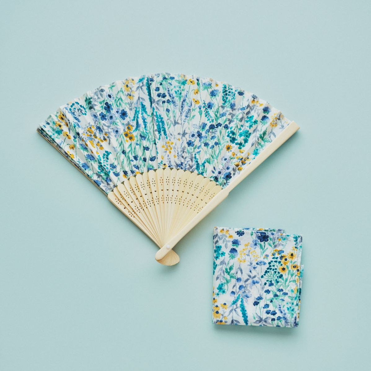 涼しげなブルーをベースに、可憐な花々が描かれた扇子とハンカチ。クラシックな扇子は、あおぐ姿をどこか上品に彩ってくれるうえ、装いに愛らしいアクセントを添えてくれます。コンパクトに収納して持ち歩けるのもうれしいポイント。ハンカチは薄手で心地いい肌ざわりの綿ローン素材。実用的で長く愛用できるところも魅力です。
