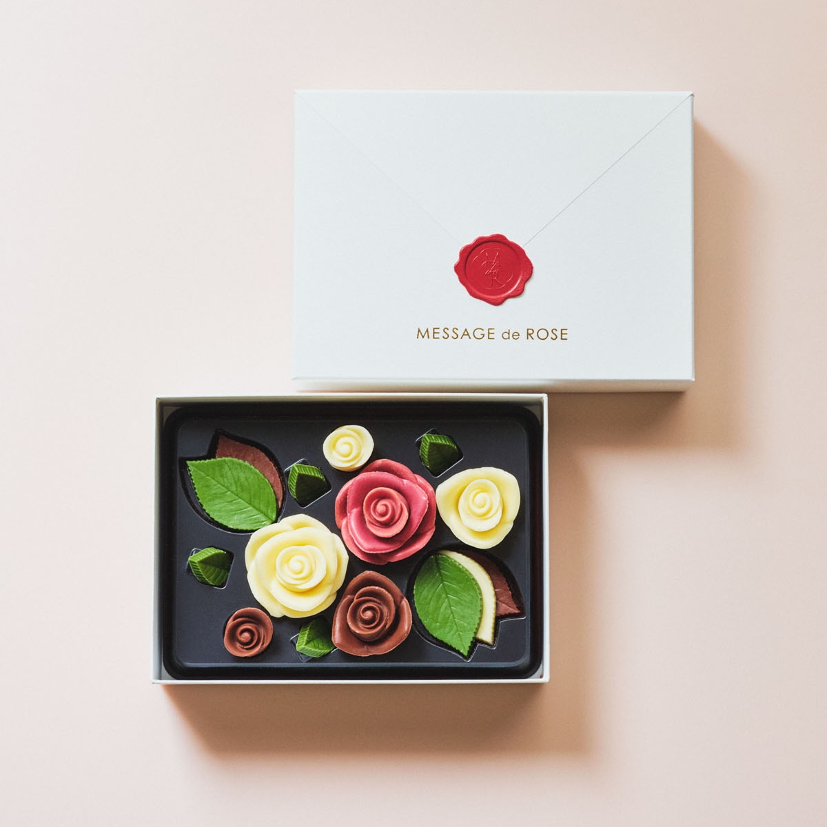 花びらまで一枚一枚丁寧に再現したバラの形のチョコレートは、まるで本物のバラのよう。バラは華やかなイチゴや濃厚なホワイトチョコレート、葉っぱには芳醇な味わいのミルクチョコレートや香り高い抹茶を使用し、やわらかな口どけのチョコレートが楽しめます。