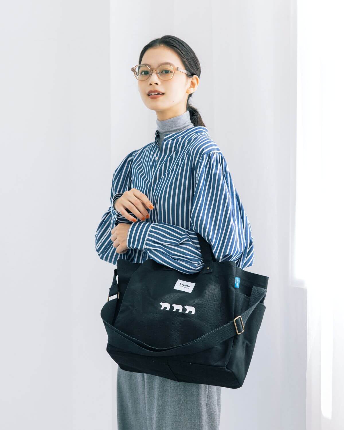 PCを入れても余裕あり。たっぷり大容量が魅力的。オーガナイズショルダーバッグ ブラック¥6,930/kippis(宝島チャンネル)、ストライプシャツ¥17,600/マノン(エムケースクエア)、タートル¥13,200/ブイ(クロスワード)、グレーパンツ¥24,200/アデュー トリステス(アデュー トリステス)、メガネ¥49,500/カーニー(ソスト)