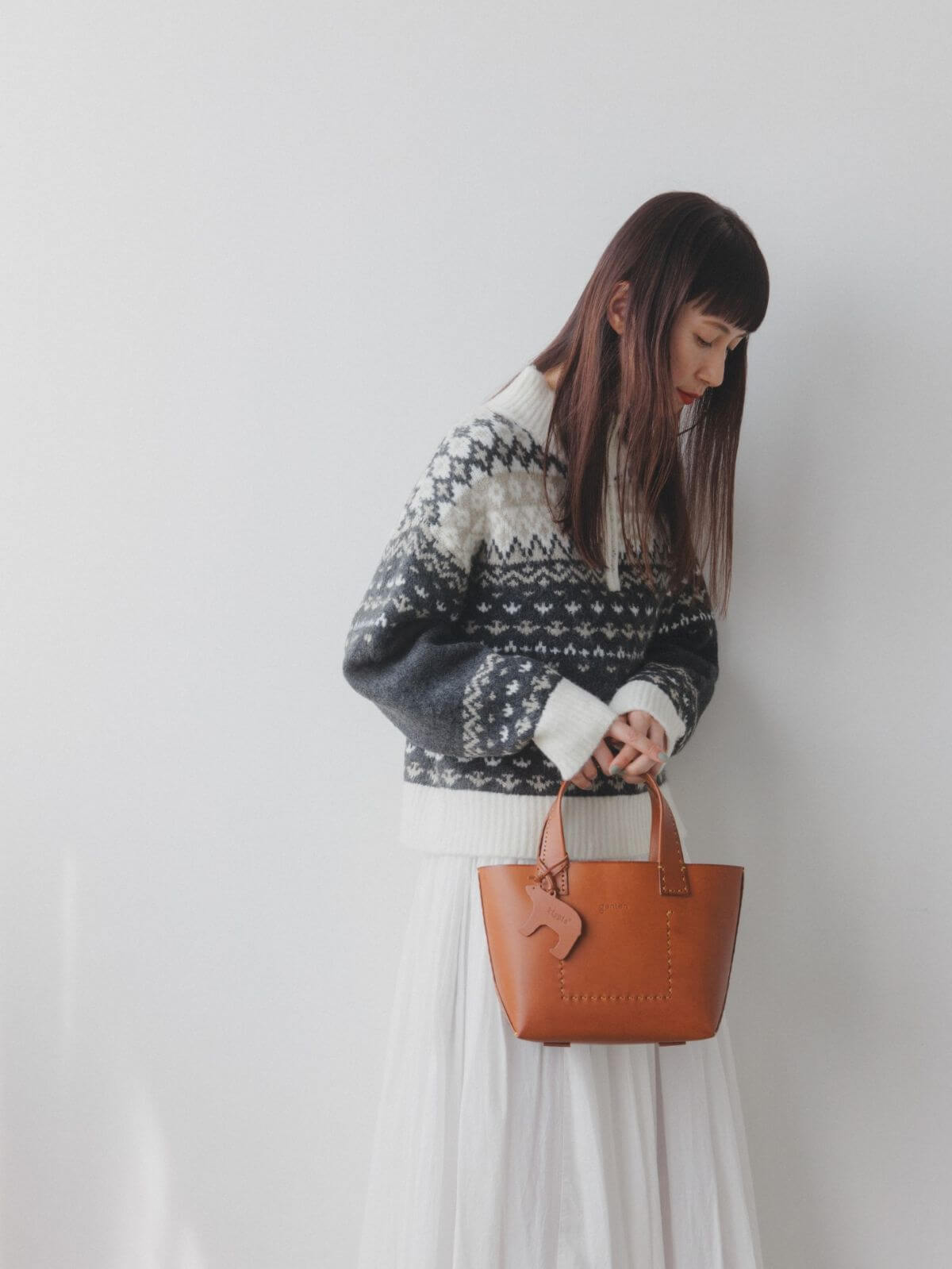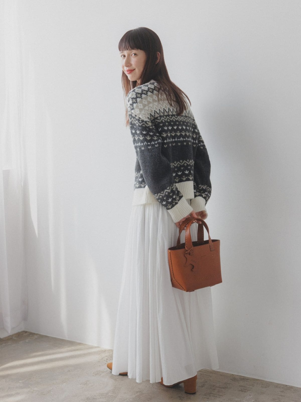 ノルディックなニットに、ホワイトのスカートを合わせて、軽やかに着こなして。コラボバッグの明るめブラウンとブーツの色みを合わせて挿し色にするのも、これからの季節に真似したいテクニック。秋冬の着こなしにはダークトーンが増えがちですが、白を味方にすればシンプルなコーディネートの鮮度をアップできます。