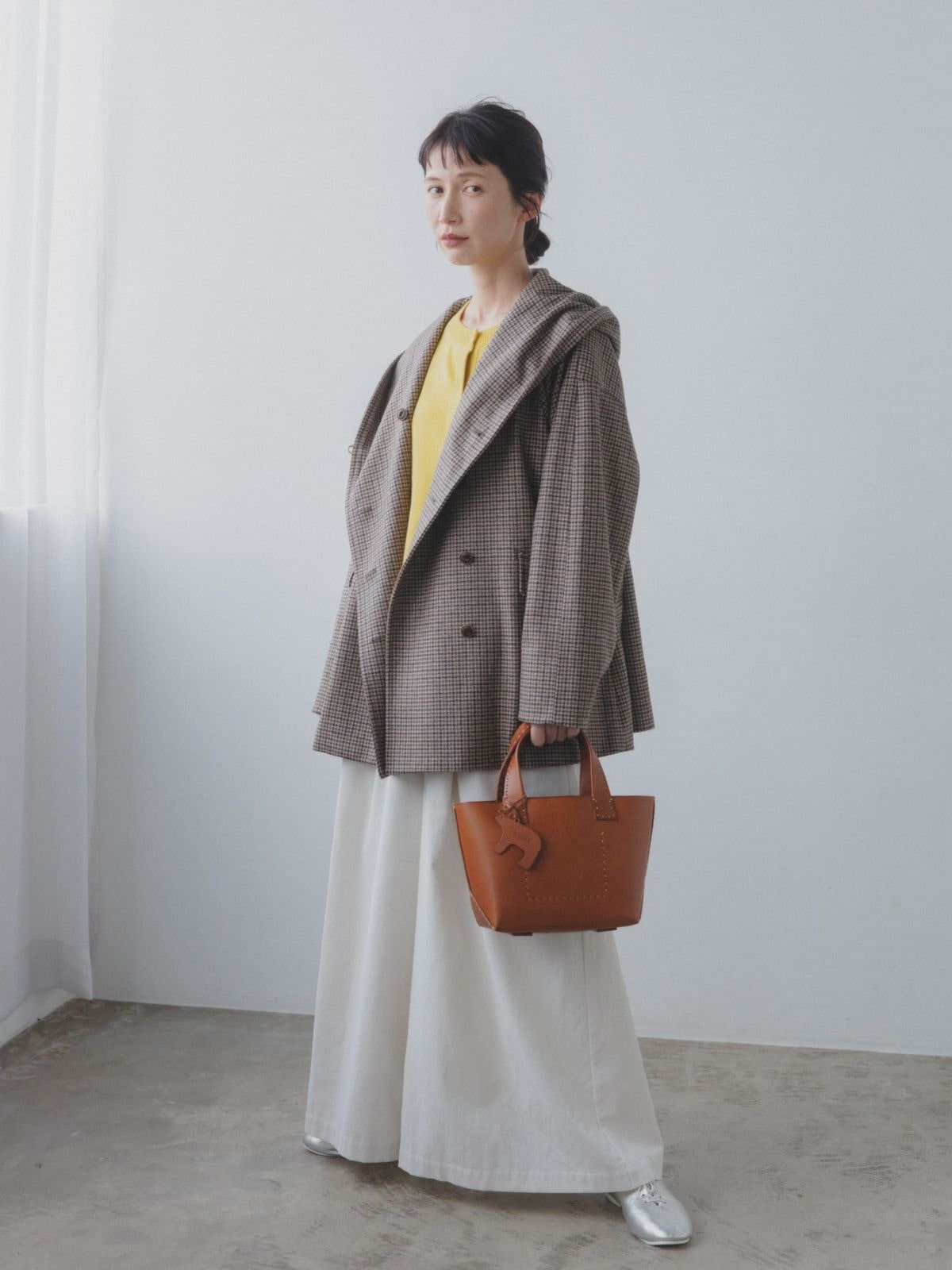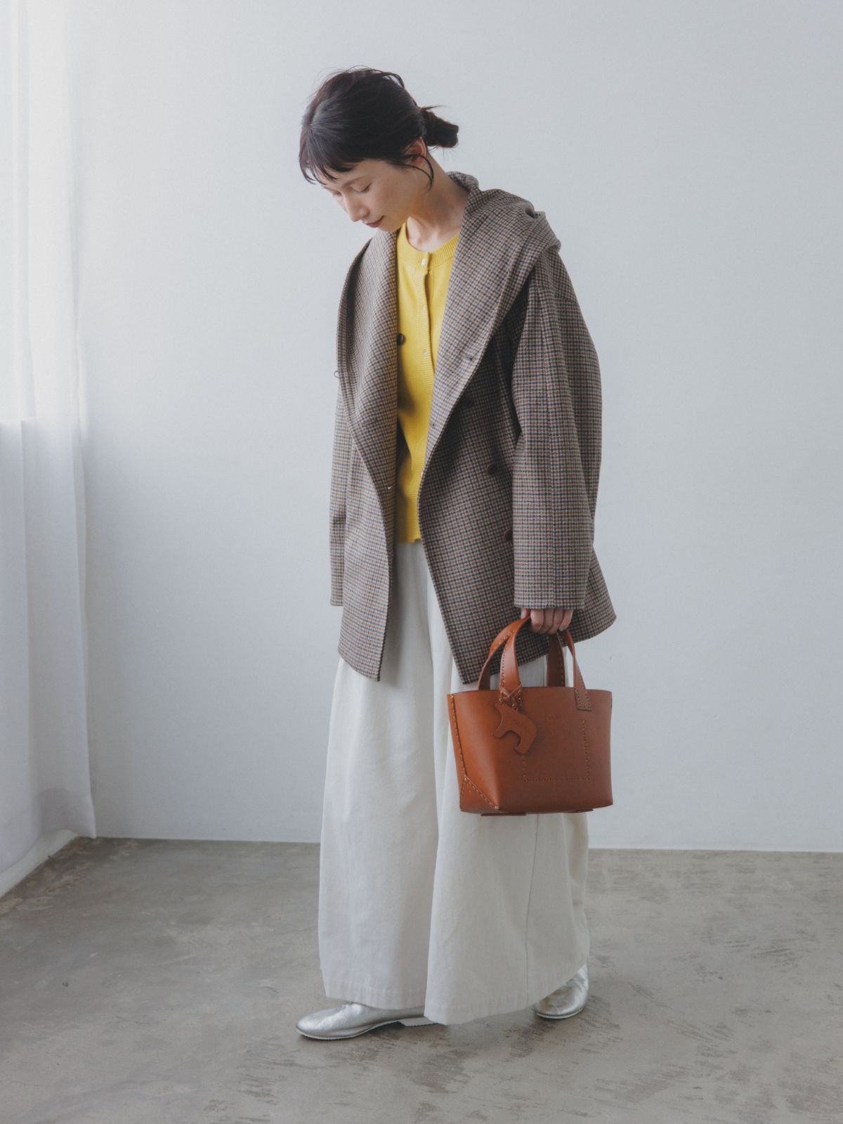 フードにもなる襟がコーディネートに動きをプラスするワイドシルエットのコートは、モカブラウン系のチェックを選ぶとカジュアルな雰囲気。きれいめのホワイトのワイドパンツでリラクシーなシルエットが完成。ニットカーディガンのマスタードイエローと、バッグの挿し色ステッチ糸がリンクしているのもワザあり!