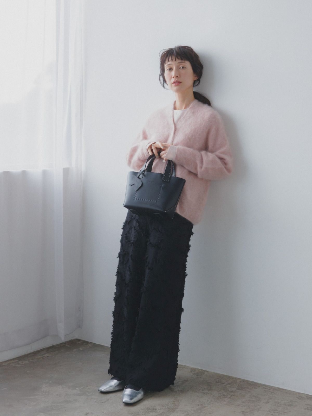 ベビーピンクのモヘアニットカーディガンを、フリンジ刺繍がアクセントになったブラックのパンツにオンした大人かわいいコーディネートに、シルバーのパンプスでピリッと辛さをプラス。リッチなレザーバッグを持つことで、一気にエレガントな雰囲気に。ライトフォーマルなシチュエーションもOKなきちんと感と抜け感を両立。
