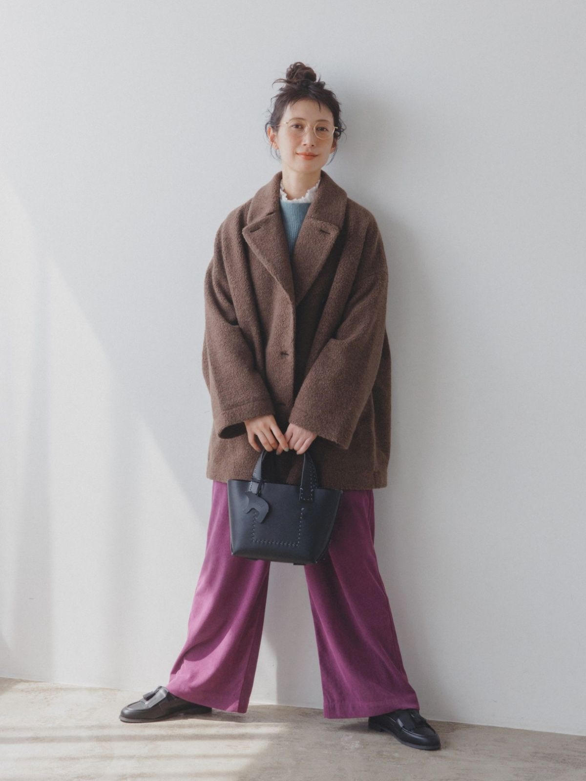 ライトブルーのニットに明るいパープルのパンツを組み合わせた色×色コーデも、テディベアのような起毛素材のピーコートのブラウンで包めばシックにまとまります。バッグとシューズはブラックで揃えて、コーデの引き締め役に。ニットのなかに着たフリル襟がチャーミング!