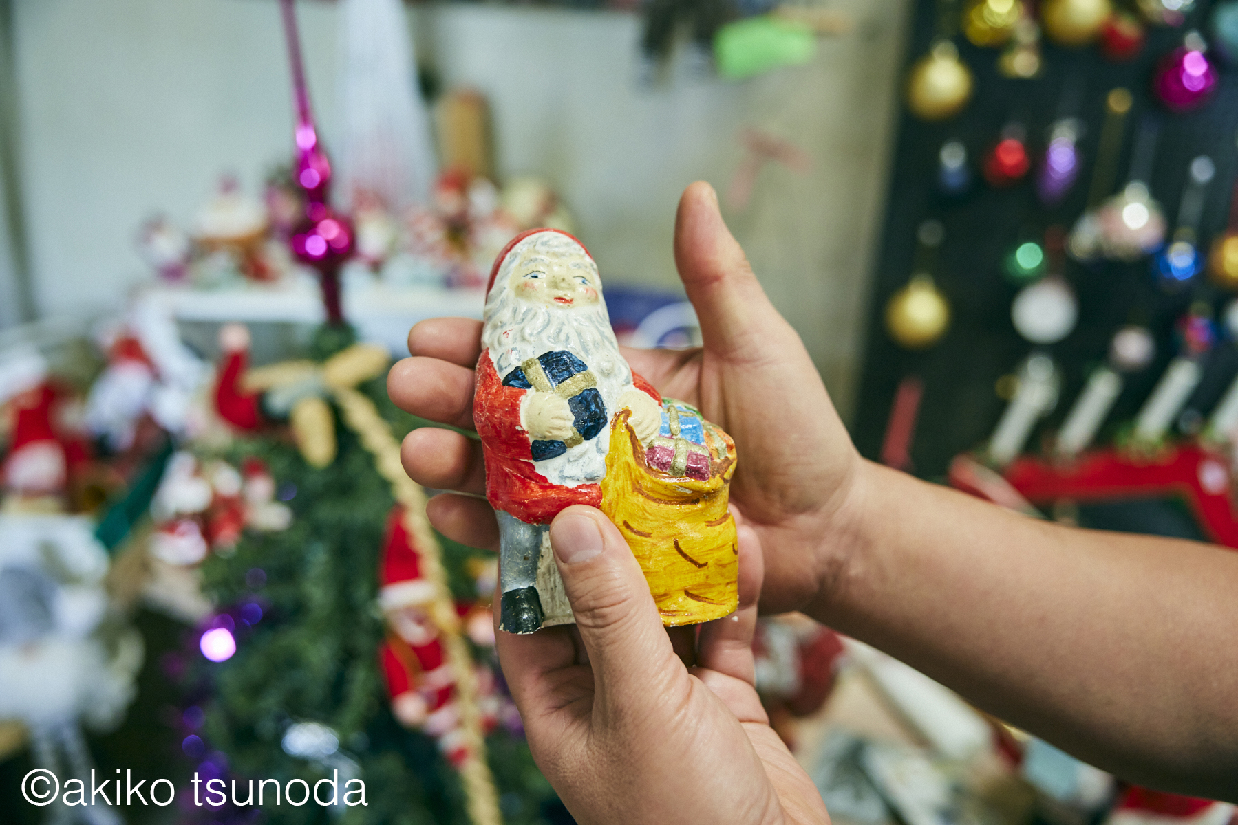 棚いっぱいに並ぶオーナメントやサンタさん、ニッセの人形、手作りの飾りは、どれも誰かの日々をそっと彩ってきたもの。眺めているだけでもワクワクします。