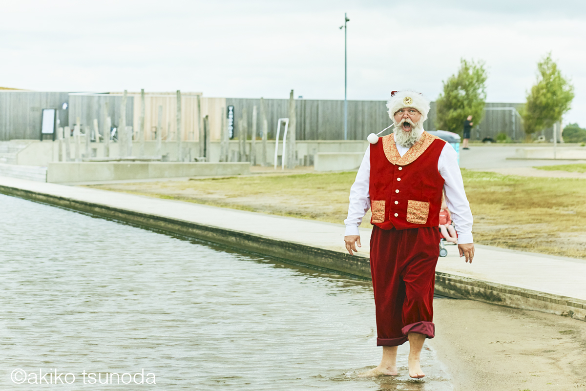 思ったより水温が冷たかったようで、びっくりしているサンタさん