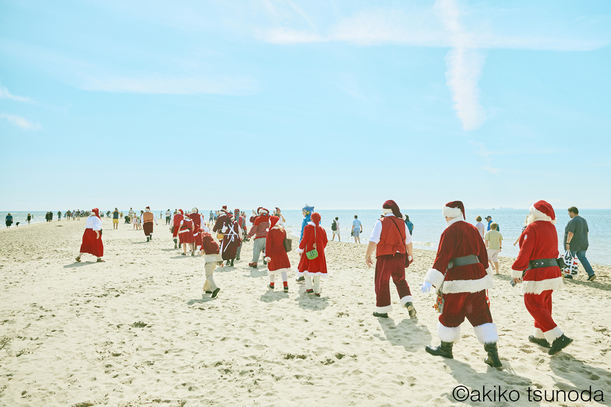 澄んだ青の海と空に、サンタさんの赤がくっきりと映えて、コントラストが鮮やかです。