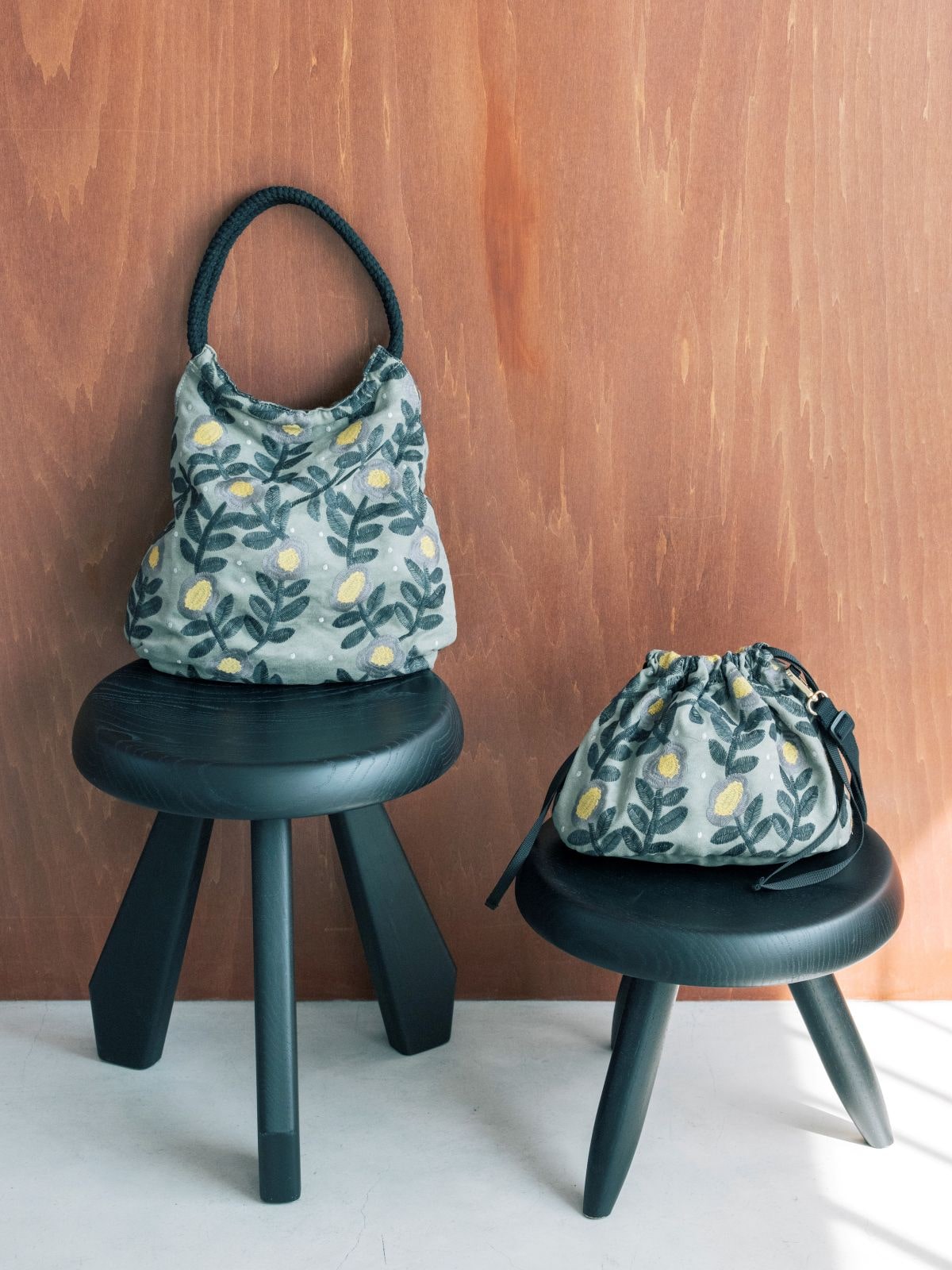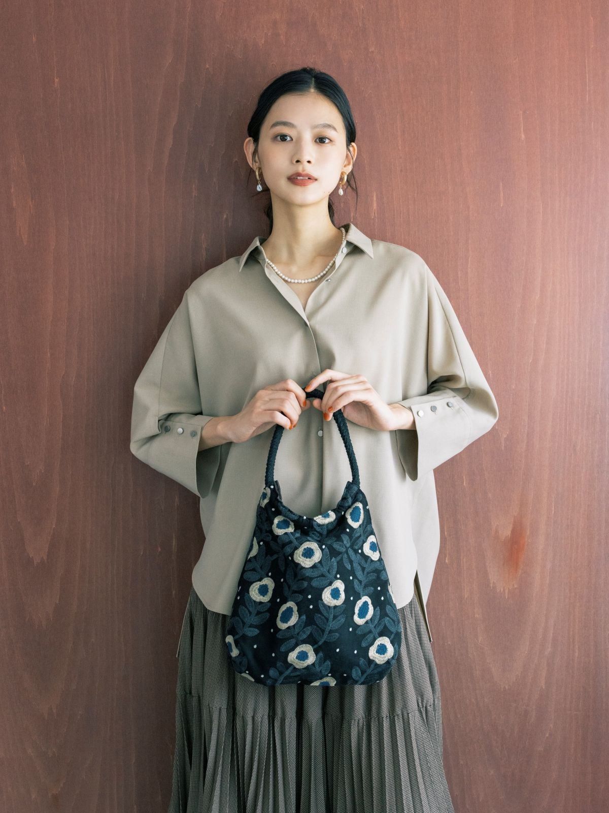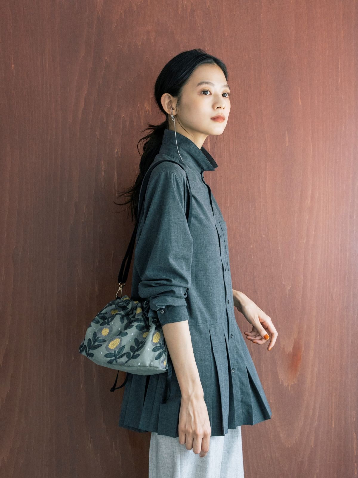 刺しゅう巾着ショルダーバッグsmoke green¥7,447/kippis(宝島チャンネル)、シャツ¥25,300/マノン(エムケースクエア)、パンツ¥14,300/ノンブルアンペール(ローラデックス)