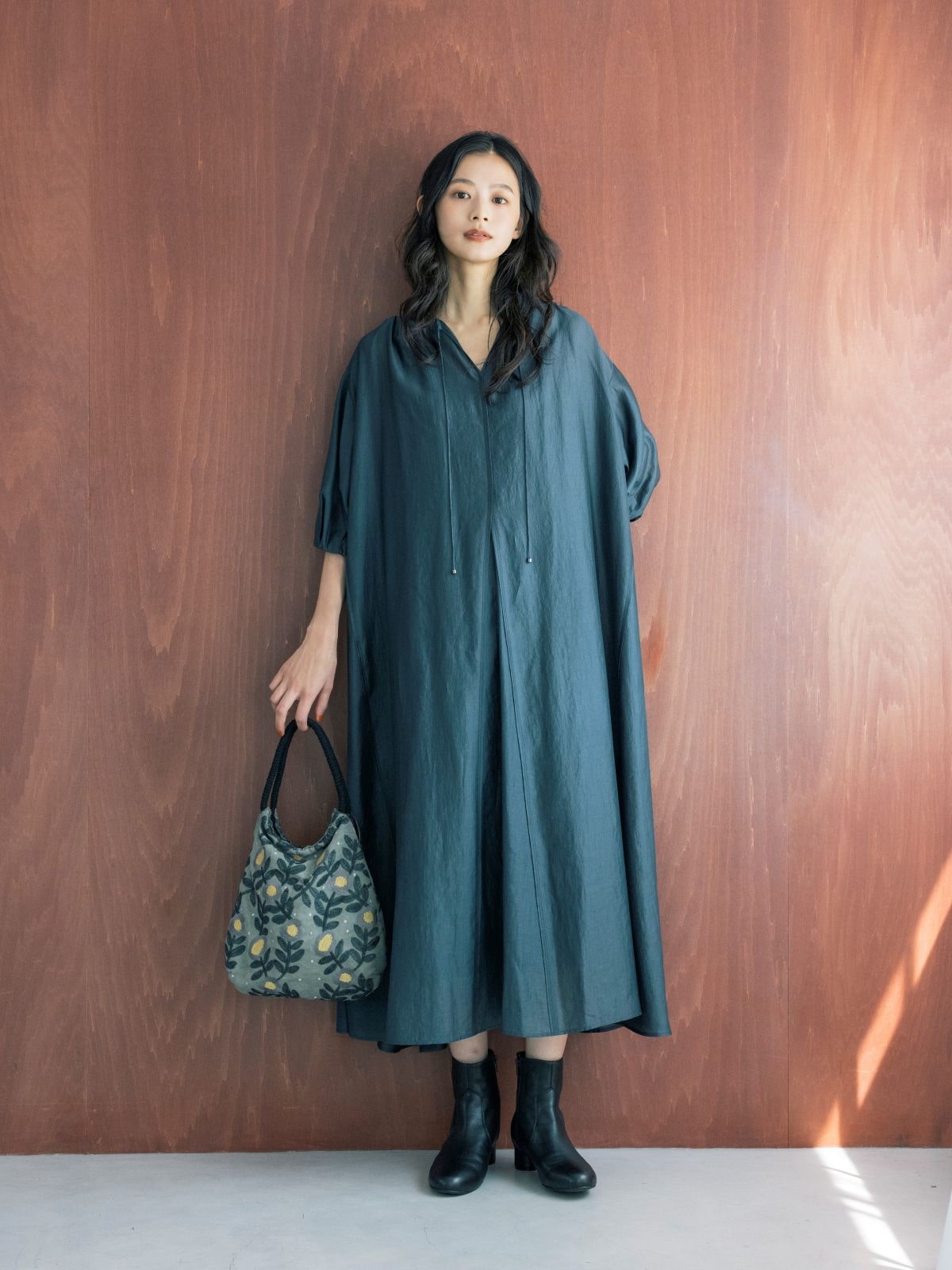 刺しゅうラウンドトートバッグ smoke green¥8,943/kippis(宝島チャンネル)、ワンピース¥55,000/モガ(モガ)、イヤカフ¥2,530/ダナエ∴(ダナエ∴)、ブーツ¥35,200/アデュー トリステス(アデュー トリステス)