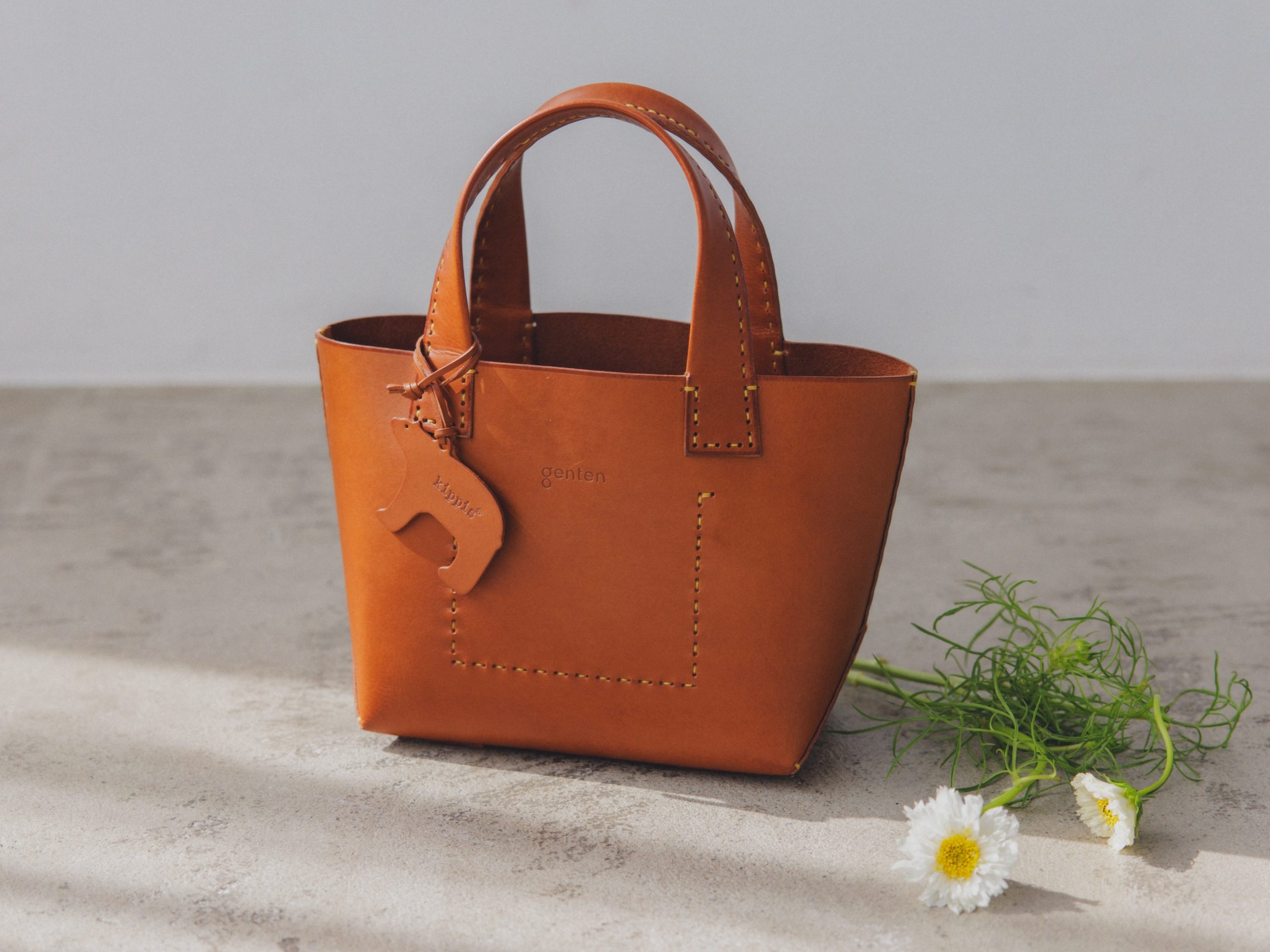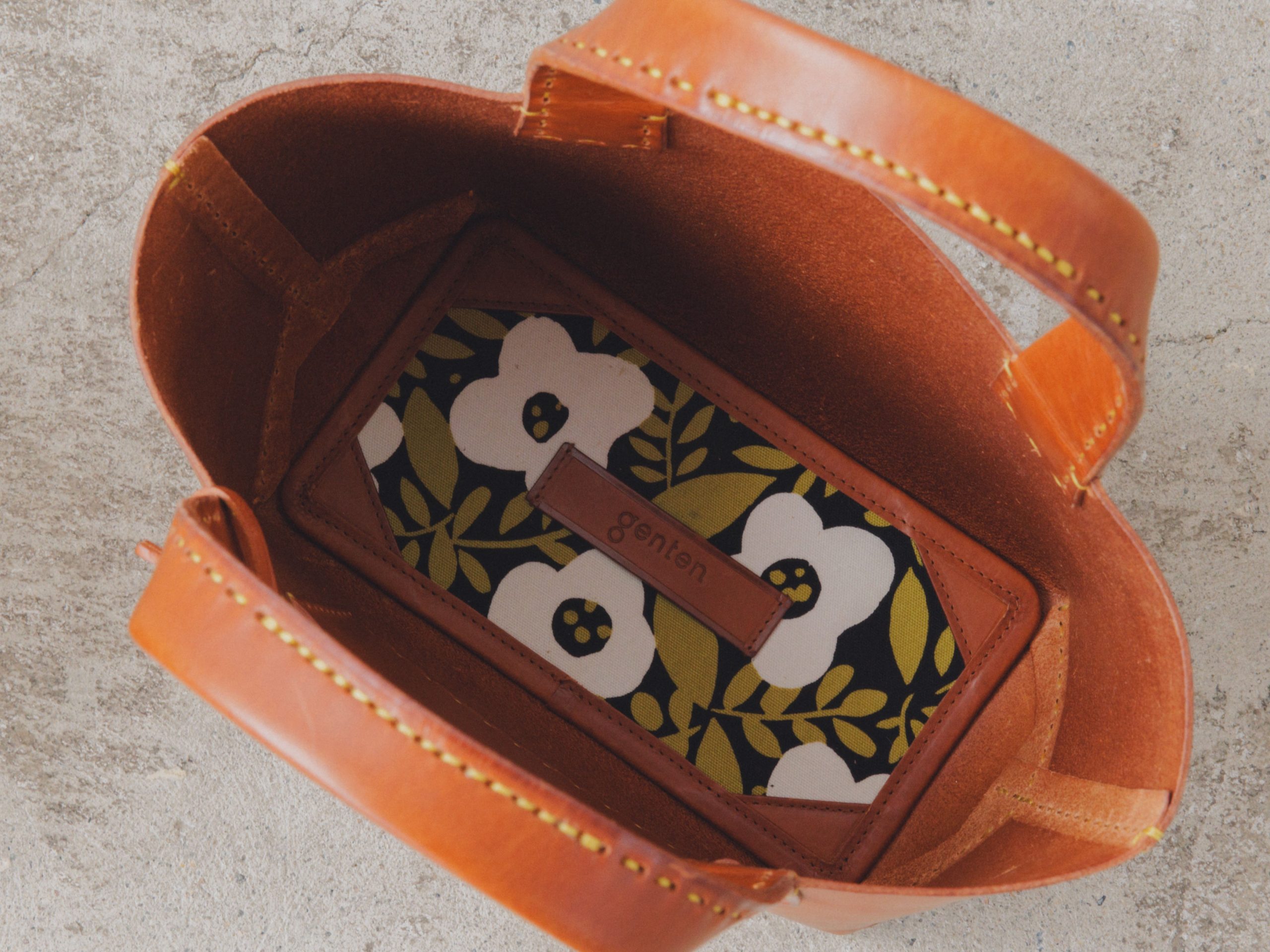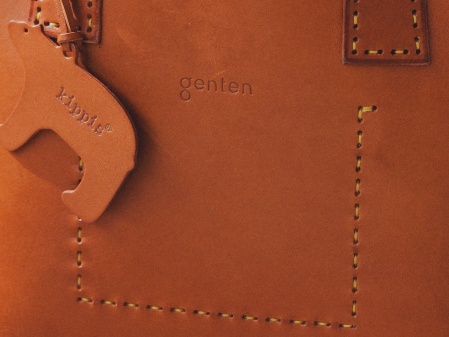 gentenのシグネチャーマテリアル、フルタンニンなめし革のなかでも、革本来の風合いがもっともよく表れるブラウン。ステッチは遊び心を利かせたイエローをセレクト。