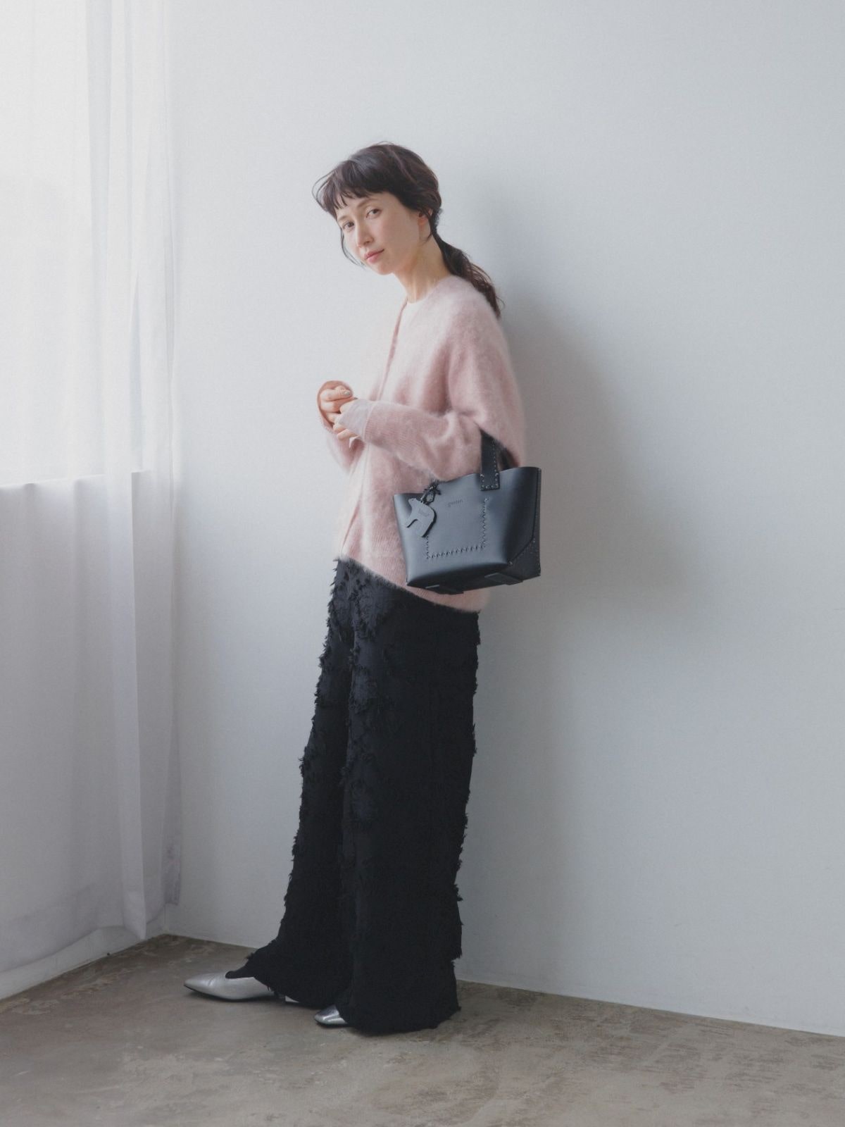 カーディガン¥66,000、中に着たトップス¥25,300/ともにロワズィール、パンツ¥6,490/サニークラウズ(フェリシモ)、靴/スタイリスト私物