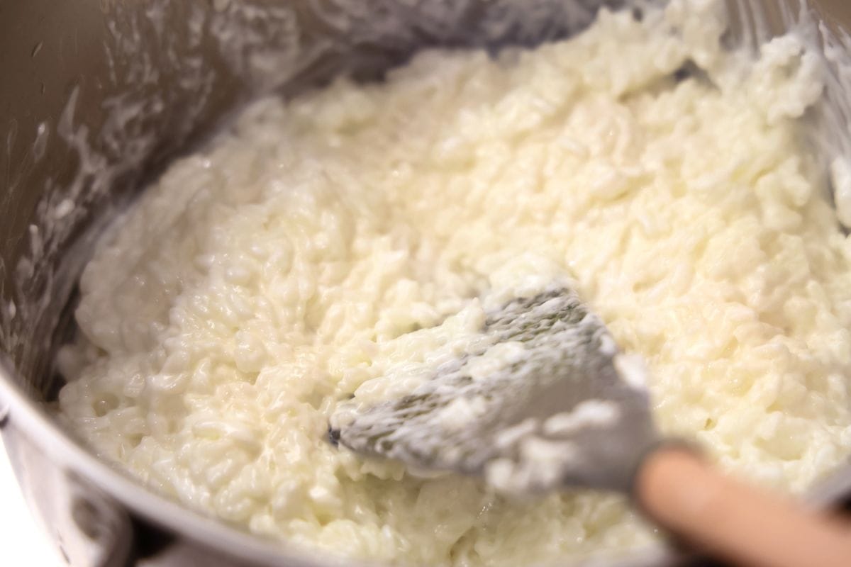 ②少しずつ牛乳を加えながら、約45分程弱火で混ぜ続け、やわらかくとろみがつくまで煮ます。