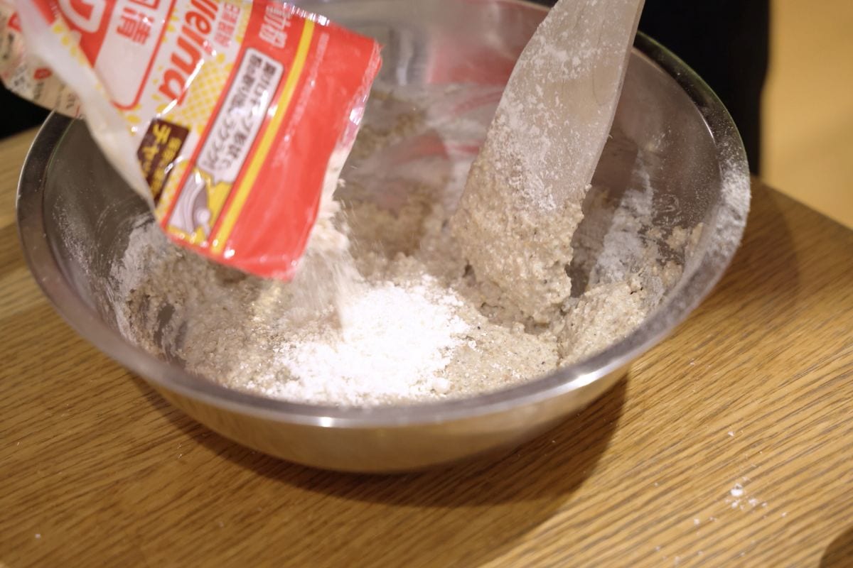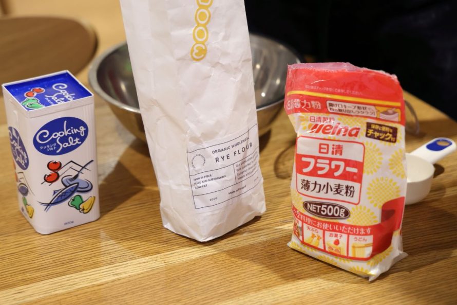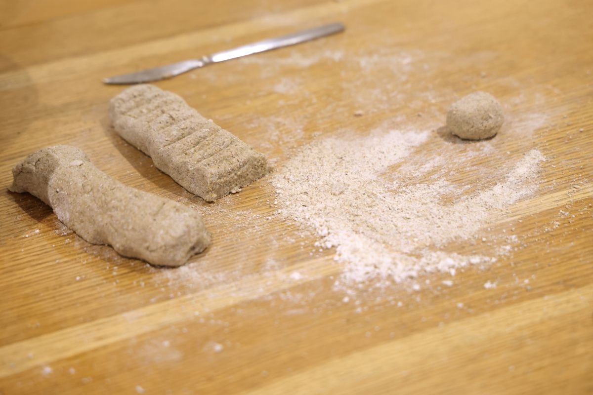 ①水、塩、ライ麦粉、小麦粉を混ぜ合わせ、硬めの生地を作ります。