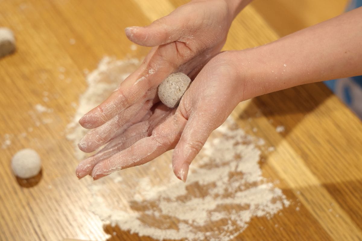 ②生地を棒状にまとめて、20等分に切り丸めます。