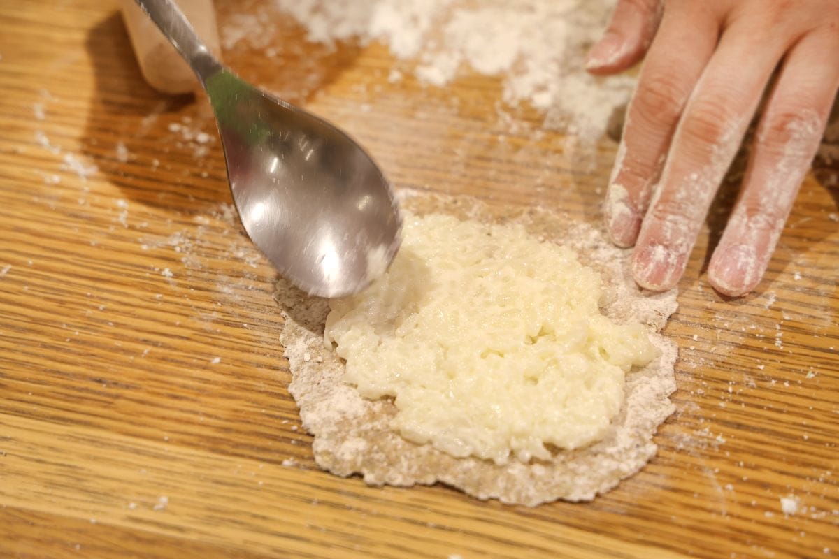 ①のばした生地の中央に、米がゆを大さじ1ほどのせます。周囲2cmほどはあけておきます。