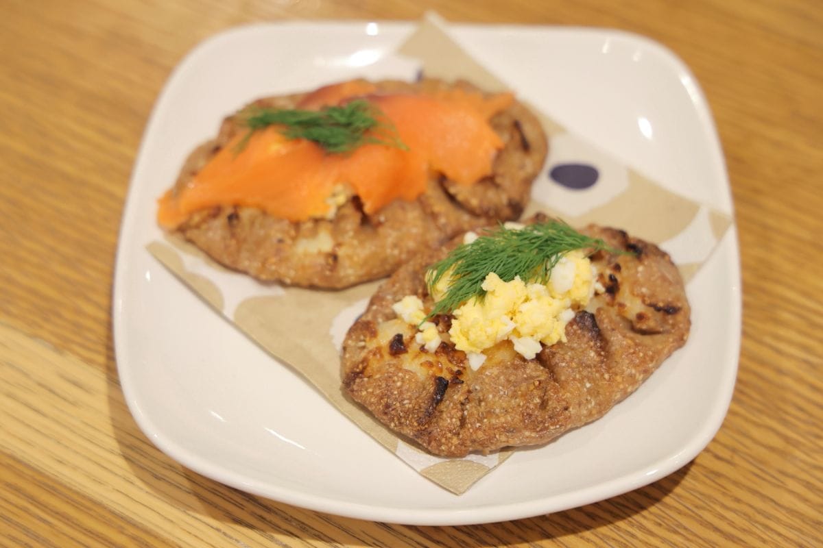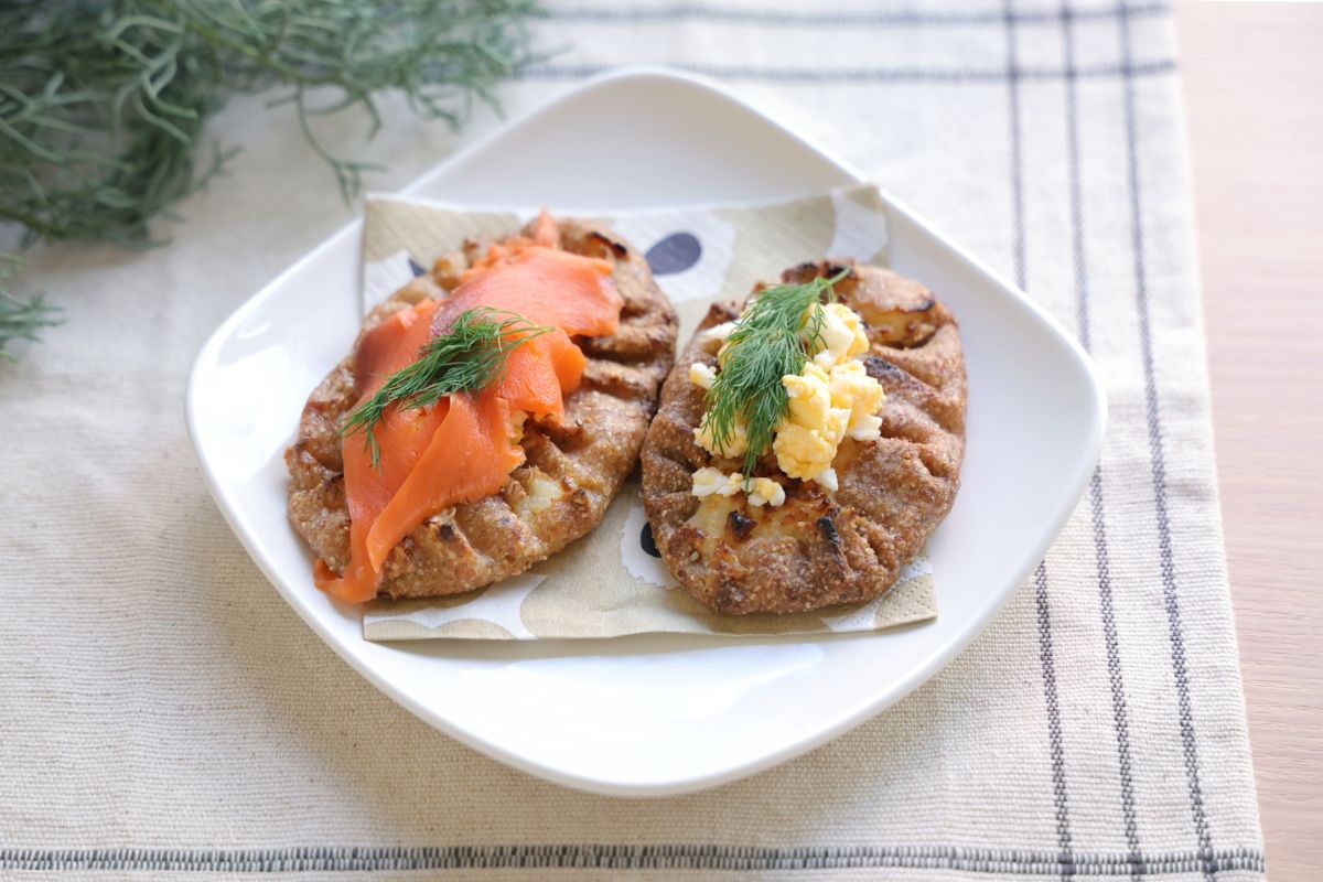 そのままで食べてもおいしいカルヤランピーラッカですが、フィンランドで定番のトッピングは「卵バター」。刻んだゆで卵とバターを適量よく混ぜ合わせるだけの(塩で味を調えてもよい)シンプルなレシピですが、カルヤランピーラッカの香ばしさとバターの香りがベストマッチ! その上にディルをのせたらフィンランドの味が完成です。そのほかにも、サーモンをのせてみたり、ベリーのジャムやクリームチーズなどを合わせてみてもよさそう。ベースがシンプルな味なので、しょっぱいも甘いもトッピングを色々と変えて楽しめるところも、フィンランド版の“おにぎり”といわれる理由かもしれません。
