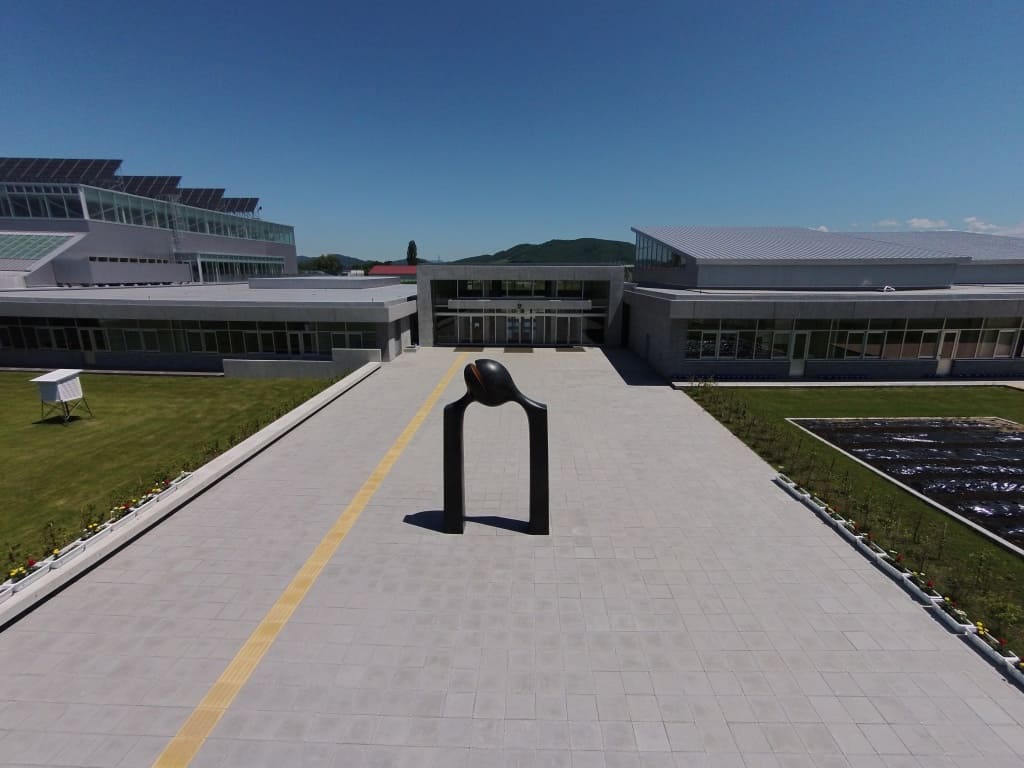 平屋建て「壁」のないオープン教室が珍しい東川小学校。北海道ならではの広々した小学校は、学童保育機能を持つ地域交流センターも隣接。敷地内には安田侃氏の彫刻作品などが設置され、子どもたちが本物の芸術を体感しながら学んでいます。