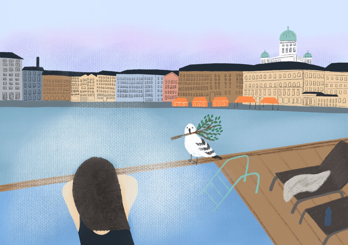 ヘルシンキのサウナはとってもアットホームで心地よかったそう。極寒で水面から蒸気が湧く、外の温水プールから見たヘルシンキの街並みが幻想的できれい。2度目のフィンランドでも立ち寄った、お気に入りになった場所をイラストにしました。