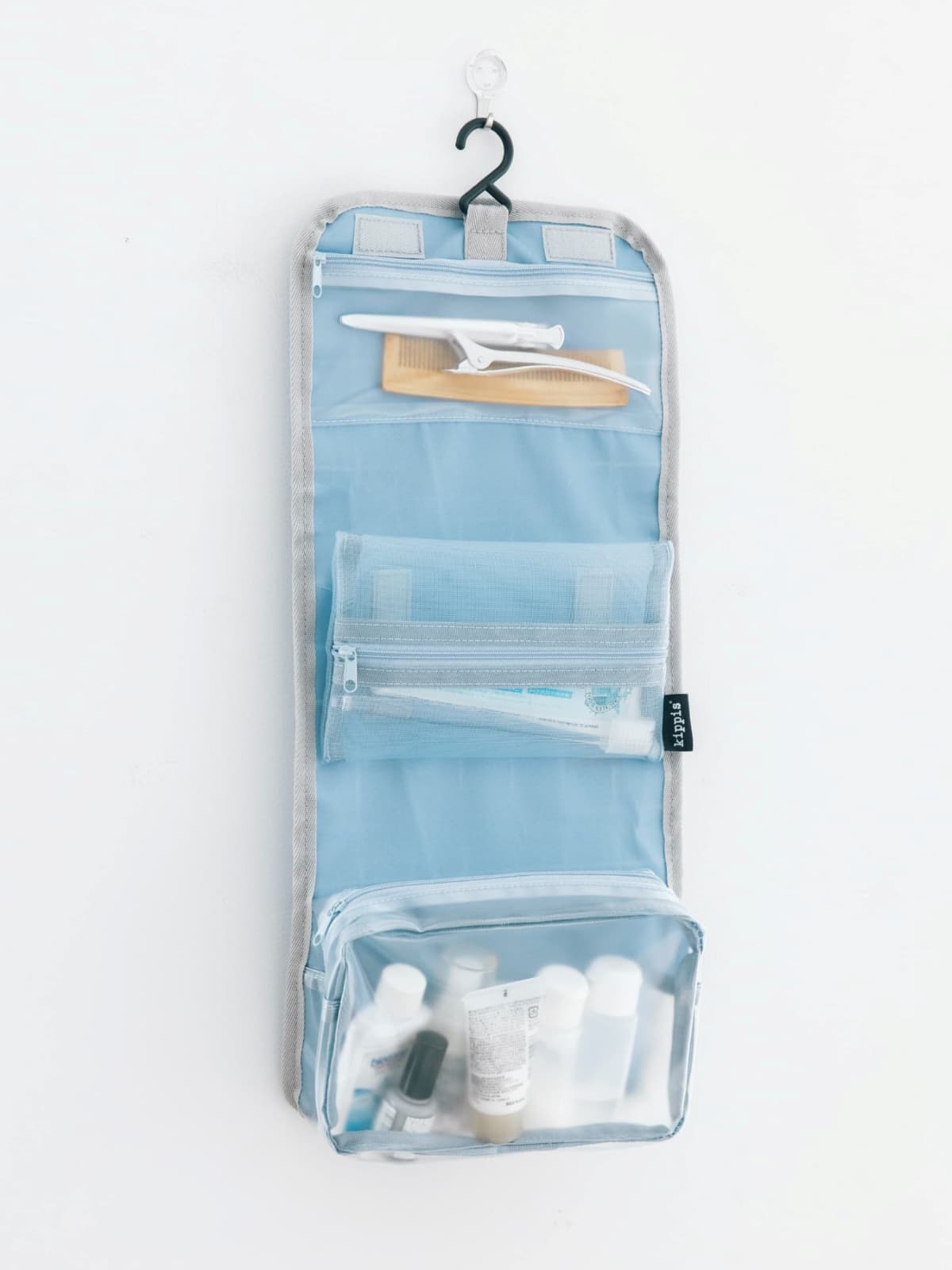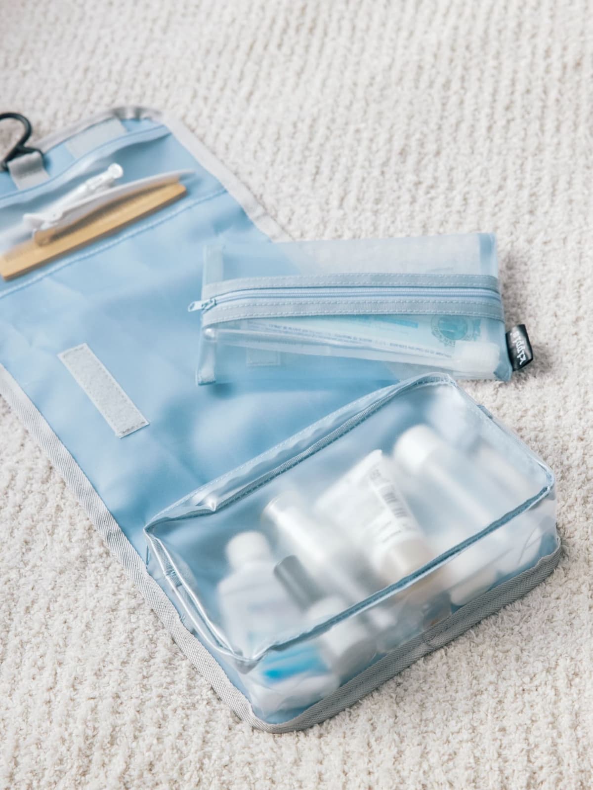 サイズ別に3箇所の収納を備えたポーチは、フックが付いているから吊り下げて使うことができます。旅先のバスルームやパウダールームで吊り下げて広げられるポーチは、ひとつ持っていると本当に便利◎。