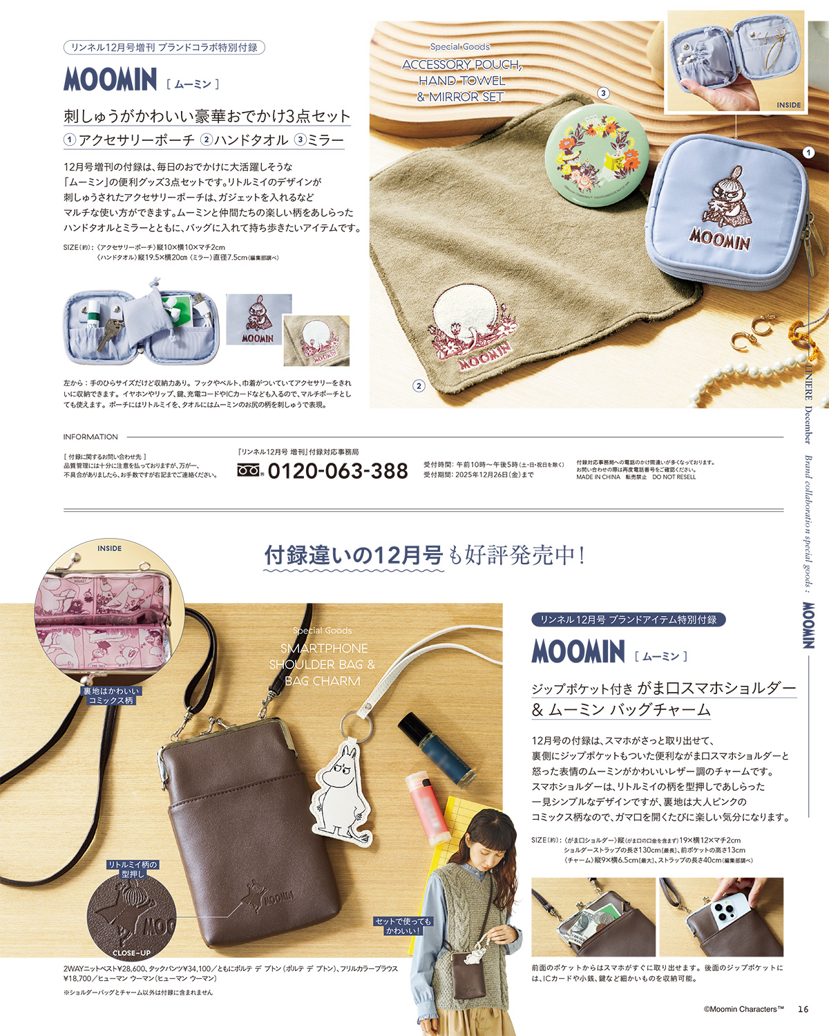 12月号増刊の付録は、毎日のおでかけに大活躍しそうな「ムーミン」の便利グッズ3点(アクセサリーポーチ、ハンドタオル、ミラー)セットです。