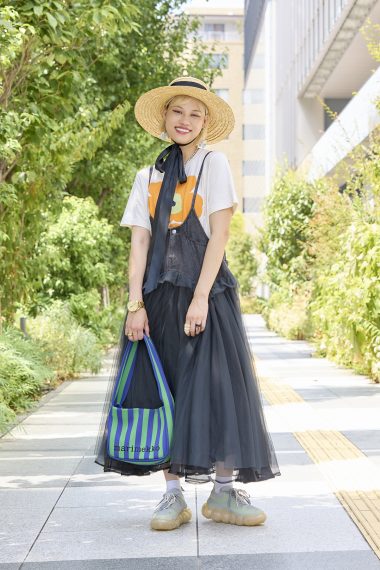 「トートバッグは東京・下北沢のサンドイッチ屋“サンドイッチクラブ”のもの。お店自体も素敵で、色味と大きく文字が入ったデザインがお気に入り」
