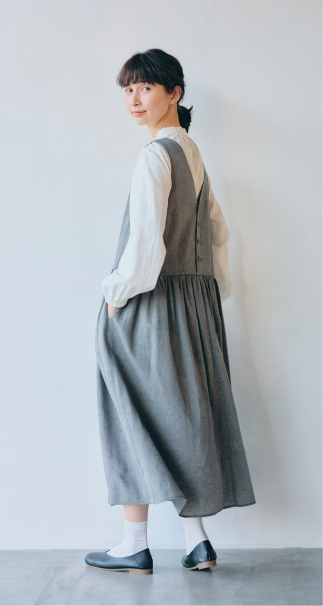 綿麻素材にテンセル™繊維を加えたヘリンボーン柄ワンピースは、ゆったりシルエットが心地いい。どちらを前にしても着られて、カジュアルにも、きれいめコーディネートにも重宝します。合わせたのは、肌触りやわらかなコットンUSAのダブルガーゼを使ったブラウス。さりげないフリルでクラシカルに仕上げて。