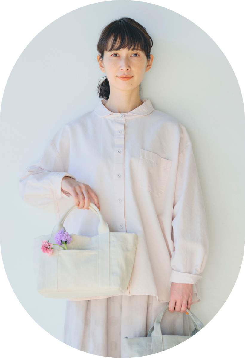 ハリ感のあるコットンUSAのオックスを使った、メンズライクなシャツは、小さな丸襟と淡いピンクカラーで甘さをON。さりげないドット柄を施したグレージュのワイドパンツ、キャンバスのミニトートとともに春のワントーンで合わせれば、足取りまで軽やかに。